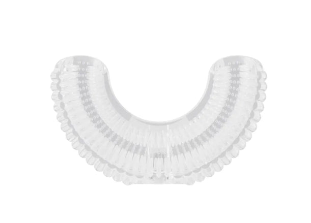 Answer 2: The U-shaped brush head fits comfortably in a child's mouth, allowing it to clean all teeth simultaneously, ensuring thorough brushing without the need for complex movements.