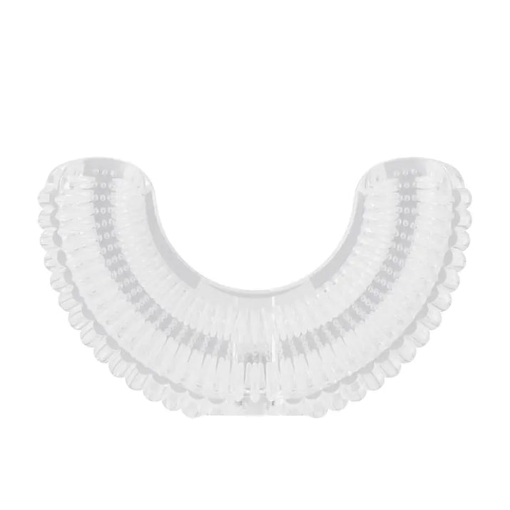 Answer 2: The U-shaped brush head fits comfortably in a child's mouth, allowing it to clean all teeth simultaneously, ensuring thorough brushing without the need for complex movements.